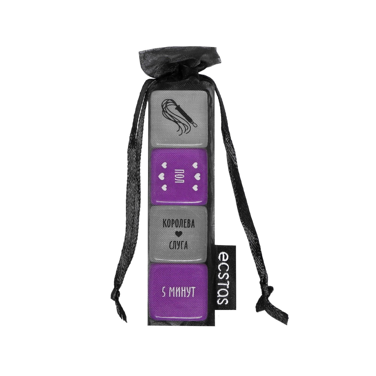 Тогда этот набор - то, что вам нужно. Внутри вас ждут 4 кубика. Первый определит роли, второй - место, третий - атрибут, который нужно использовать, а четвёртый - время ласки.И что с этим делать? Просто по очереди или одновременно бросьте кубики и воплотите в жизнь указанное. В комплекте: 2 неоновых кубика, 2 фиолетовых кубика, мешочек для хранения.