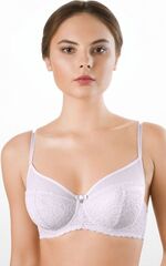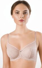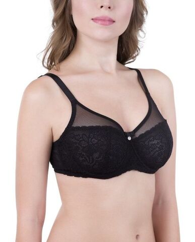 Легкий бюстгальтер в кружевном стане на большую размерную сетку. Бочок из двойной сетки. Серединка и боковая часть стана укреплены неэластичным трикотажным полотном. Тонкий атласный бантик с подвеской расположен между чашками. Регулируемые несъемные бретели (разная ширина в зависимости от размера). Материал: полиамид 80%, ликра 20%