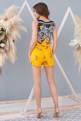 Короткий комбинезон полуприлегающего силуэта с эффектом топа и шорт, выполнен из принтованной вискозы. Комбинезон отрезной по линии талии, с кулиской на резинке. Верхняя часть с овальным вырезом горловины. Верх застегивается на пуговицы. Имеются боковые карманы.