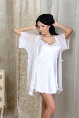 Легкий шифоновый халатик покроя кимоно, с запахом под пояс. Пояс и планка по борту выполнены из искусственного шелка, рукав короткий с эластичным кружевом по низу в тон ткани.