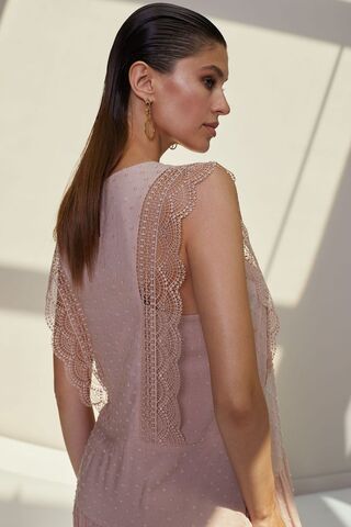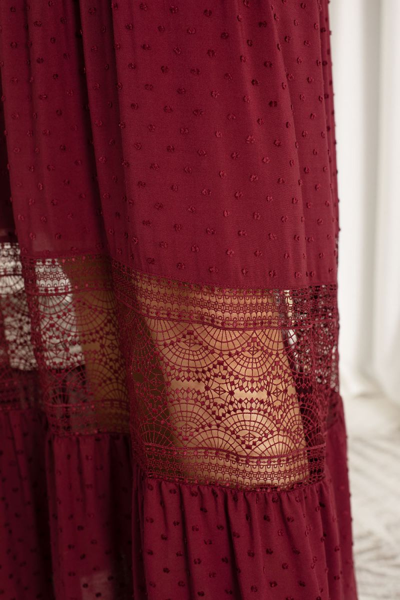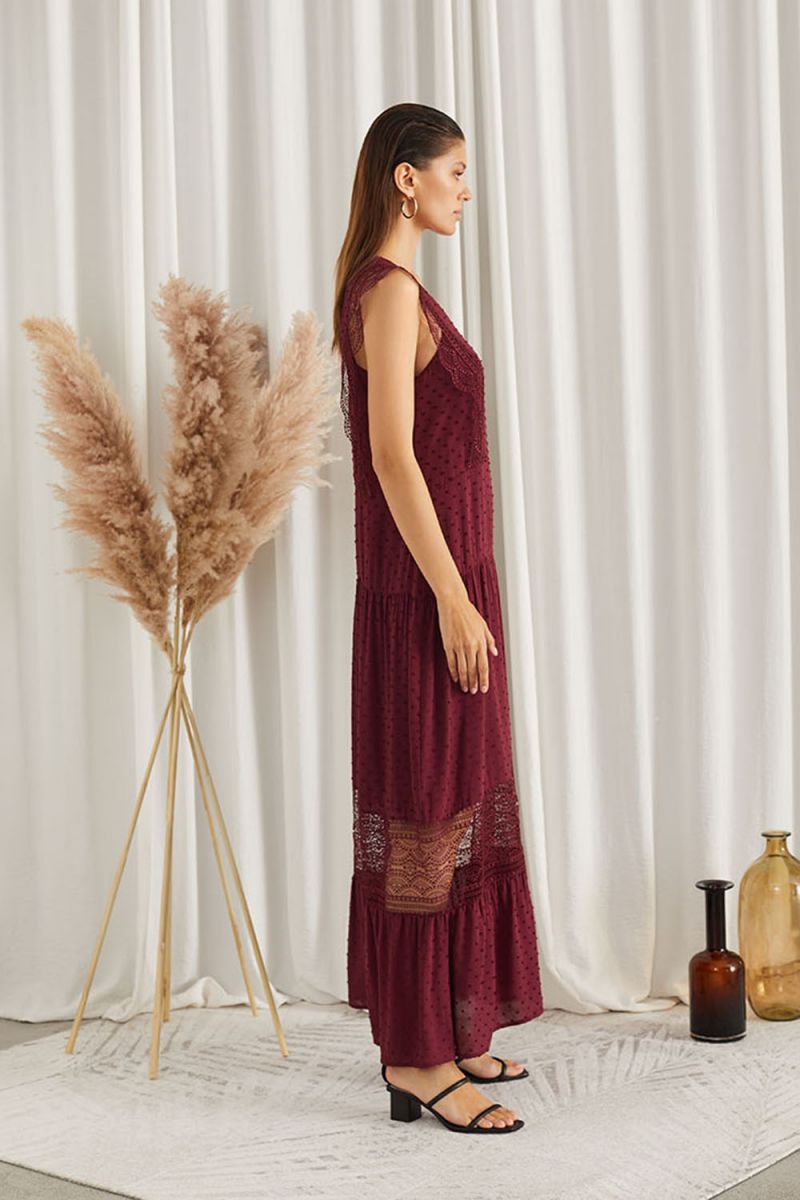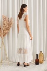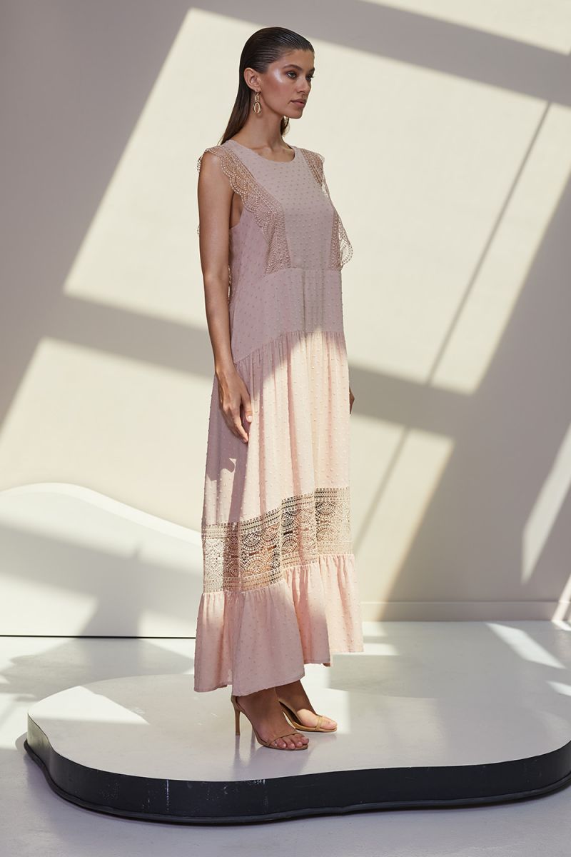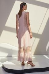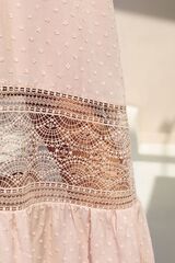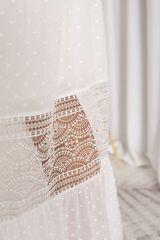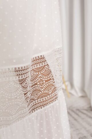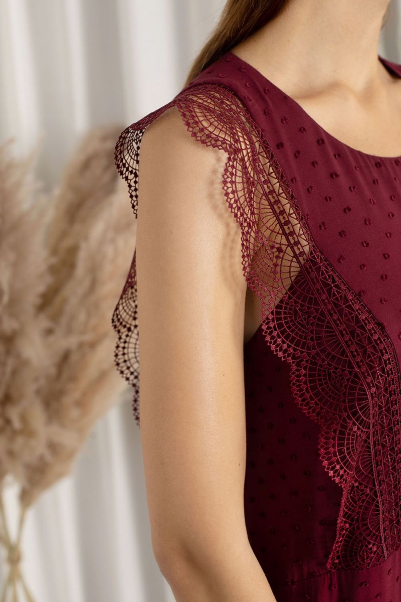 Платье выполнено из легкого, дышащего материала и декорировано вставками кружева на рукавах и подоле.