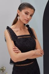 Яркий летний топ с оригинальными лямками. Хлопковая ткань кроше с оригинальным флористическим рисунком в сочетании с дизайнерской тесьмой в виде колец создают неповторимый образ. Изделие отличается женственностью и утонченностью и подойдет, как для долгих летних прогулок, так и для вечерних свиданий.