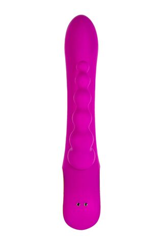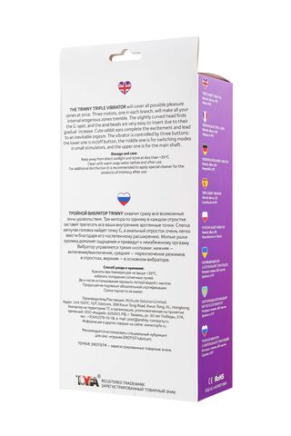 Тройной вибратор Trinny охватит сразу все возможные зоны удовольствия. Два мотора заставят трепетать все ваши внутренние эрогенные точки. Слегка загнутая головка найдет точку G, а анальный отросток очень легко ввести благодаря его постепенному расширению. Милые ушки кролика дополнят ощущения и приведут к неизбежному оргазму. Вибратор управляется тремя кнопками: нижняя - включение/выключение, средняя - переключение режимов в отростках, верхняя - в основном вибраторе. Рабочая длина - 13 см.