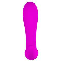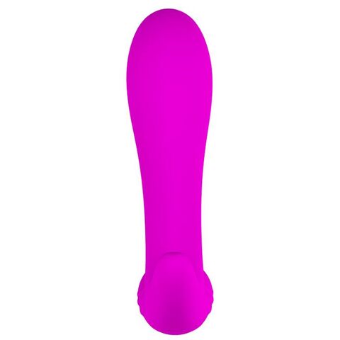 Вибростимулятор простаты Backie лилового цвета, с широким основанием для стимуляции мошонки. 30 функций вибрации. Перезаряжаемый от USB. Рабочая длина - 10 см.