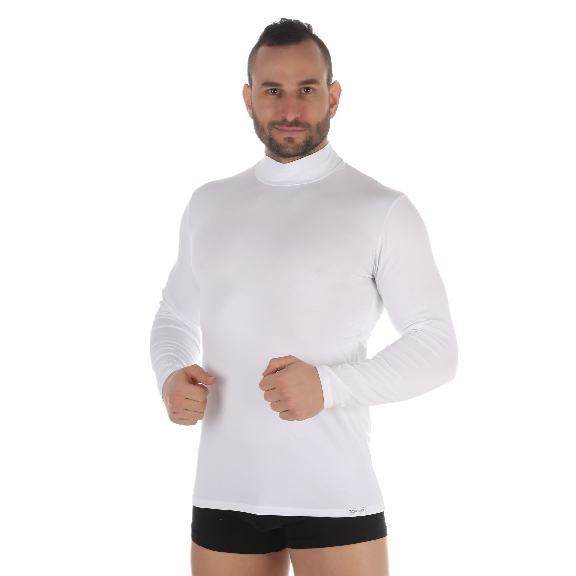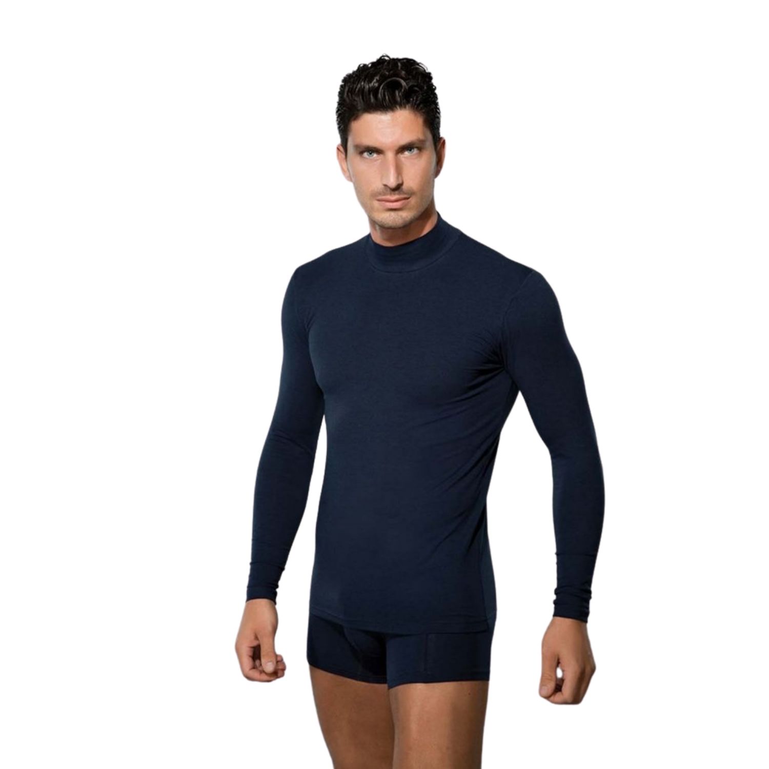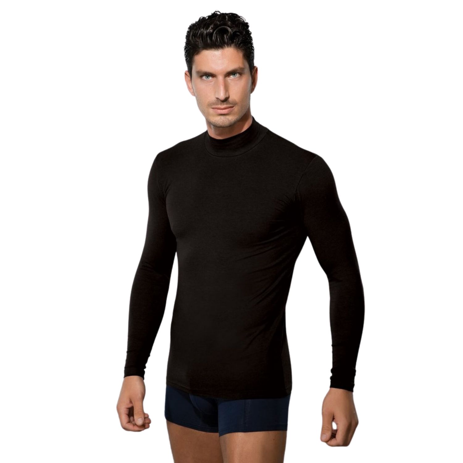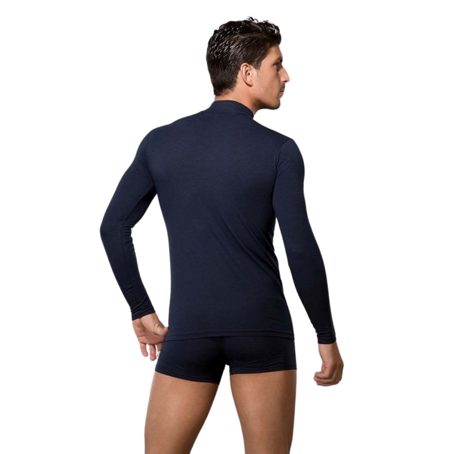 Лонгслив из натуральных материалов (хлопок + модал) с добавлением лайкры, что обеспечивает отличное сохранение формы даже после многократных стирок. Стильный воротник-стойка позволяет использовать эту футболку и как нижнее бельё, и как верхнюю одежду.