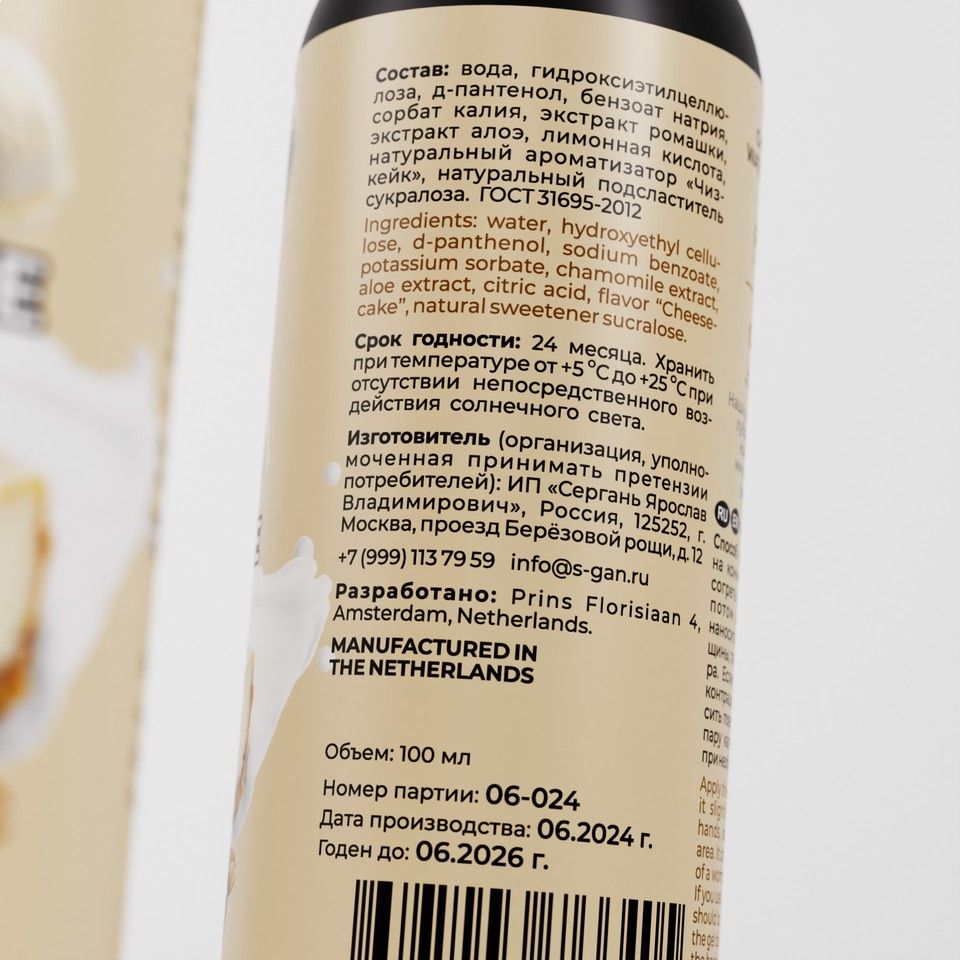 Состав вода, гидроксиэтилцеллюлоза, д-пантенол, бензоат натрия, сорбат калия, экстракт ромашки, экстракт алоэ, лимонная кислота, натуральный ароматизатор Чизкейк, натуральный подсластитель (сукралоза).