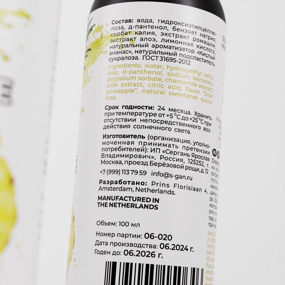 Состав вода, гидроксиэтилцеллюлоза, д-пантенол, бензоат натрия, сорбат калия, экстракт ромашки, экстракт алоэ, лимонная кислота, натуральный ароматизатор Кислый ананас, натуральный подсластитель (сукралоза).