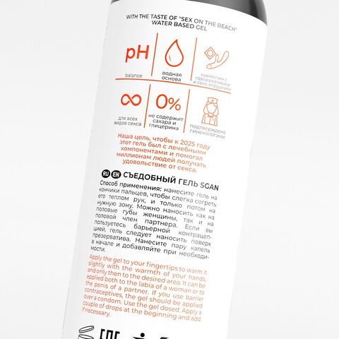 Вкусовая линейка лубрикантов SGAN разработана с учетом физиологии, совмещает в себе вкус и аромат, при этом сохраняет все регенерирующие свойства классического лубриканта. Не оставляет липкости, без химического привкуса, не содержит сахара и калорий. Для сладости добавлен натуральный подсластитель - сукралоза. Абсолютно безопасен для проникновения и при проглатывании.