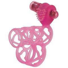 Любовная клетка из мягкого розового TPR. Универсальное кольцо-насадка. Ажурная сетка будет покрывать ствол пениса мужчины и мошонку. Вибро-элемент продевается в специальное отверстие и маленькая щеточка будет нежно массировать клитор девушки. Вибро-пулька водонепроницаемая, батарейки в комплекте. Привнесите новизны в Ваши сексуальные отношения! Размер вибростимулятора - 5 х 1 см.