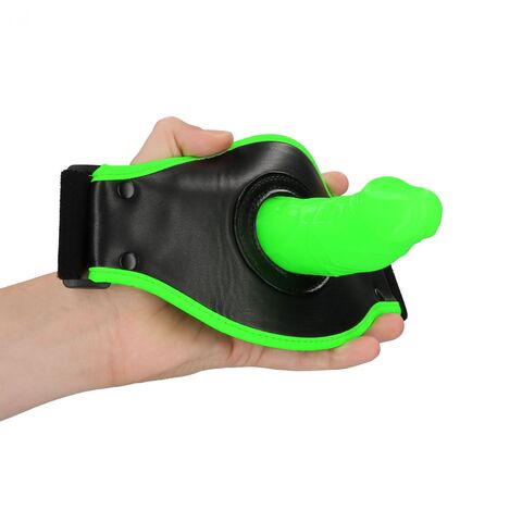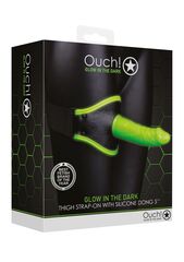 Страпон с необычным креплением на бедро. Повязка выполнена из кожи а сам фаллоимитатор из силикона, который светится в темноте. Предварительно нужно зарядить фаллоимитатор ярким светом, чтобы наблюдать яркий эффект в темноте. Подобный девайс внесет разнообразия в сексуальную жизнь партнеров и придаст большей чувственности многим позам. Крепление на резинке позволит плотно и комфортно закрепить страпон даже на полной ноге. Рабочая длина - 13,2 см.