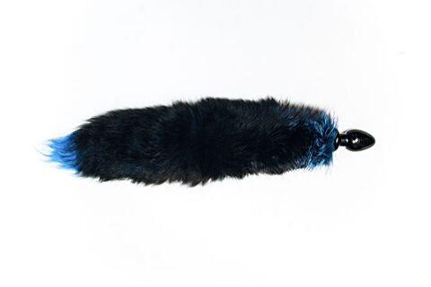 Анальная пробка черного цвета с голубым лисьим хвостом. Выполненная из дерева, она покрыта лаком для максимальной гладкости.