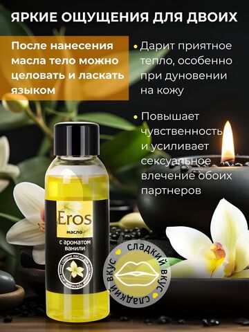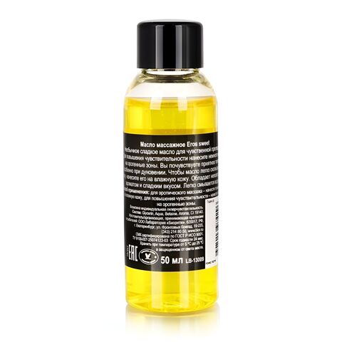 Масло массажное Eros Sweet предназначено для эротического массажа. Пьянящий аромат ванили пробуждает сексуальный аппетит. Нанесите небольшое количество масла на тело партнера и позвольте рукам скользить, а пальцам - проникать в самые чувственные складочки. Масло вызывает ощущение тепла, особенно при дуновении. Как следствие, повышает чувствительность и отклик на ласки. Масло с ароматом ванили Eros Sweet обеспечит длительное скольжение, подарит вашей паре немало чувственных моментов. Остатки средства при необходимости легко смываются с тела водой.
