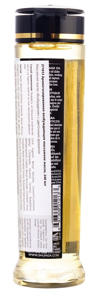 Это на 100 % натуральное масло с упоительным ароматом, легко скользит по коже, не оставляя жирной пленки. Запах массажному маслу придают эфирные масла и отдушки, что в отличие от большей части другой продукции SHUNGA, ароматизированной вкусовыми добавками, делает его несъедобным.