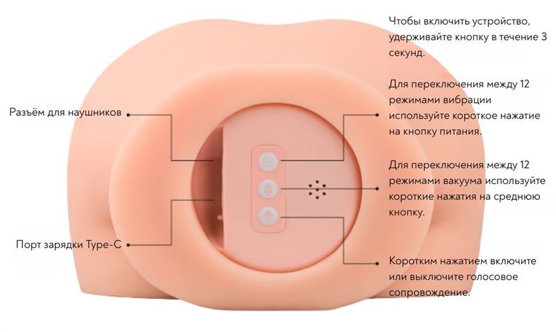 Ультрареалистичный мастурбатор, созданный в форме округлых ягодиц, сочетает в себе 12 режимов вибрации, 12 уровней вакуумной стимуляции и звуковую дорожку — это усиливает восприятие и делает использование не только физически, но и эмоционально вовлекающим. Текстурированный внутренний туннель усиливает стимуляцию и обеспечивает эффект, максимально приближённый к реальному. Изделие выполнено из мягкого и приятного на ощупь TPE, не содержащего фталатов, что делает его безопасным для тела и комфортным при контакте с кожей. Мастурбатор прост в управлении: короткими нажатиями можно переключать режимы вибрации и всасывания, а отдельная кнопка активирует звуковую дорожку. Устройство заряжается через порт Type-C, поддерживает подключение наушников и защищено от брызг воды по стандарту IPX5, что упрощает очистку и продлевает срок службы. Размеры - 29х22х24 см.