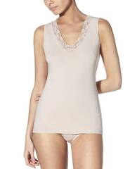 Майка без рукавов, декорированная кружевом по вырезу.