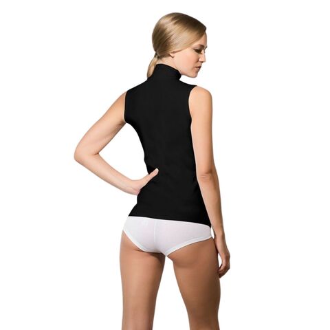 Женская облегающая майка-водолазка чёрного цвета из смеси натуральных материалов (хлопок + модал) с добавлением эластана. Удобная горловина с воротником-стойкой, как у водолазки. Мягкий эластичный материал очень приятен для тела.