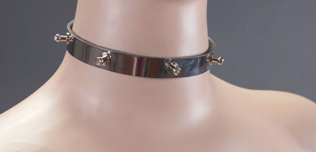 Узкий ошейник выполнен из металла и декорирован металлическими шипами со стразами. Мягкая подкладка делает ошейник удобным и комфортным для ежедневной носки. Ширина - 1,5 см.