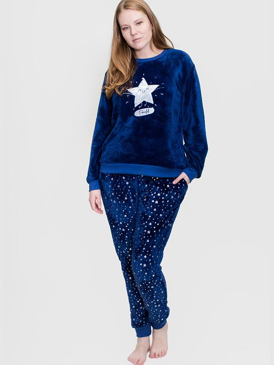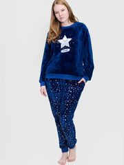Комплект из микрофибры. Свитшот из однотонной ткани, с длинным рукавом, с аппликацией, брюки прямого покроя, с рисунком, на манжетах. В комплекте: свитшот, брюки.