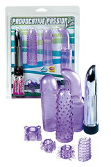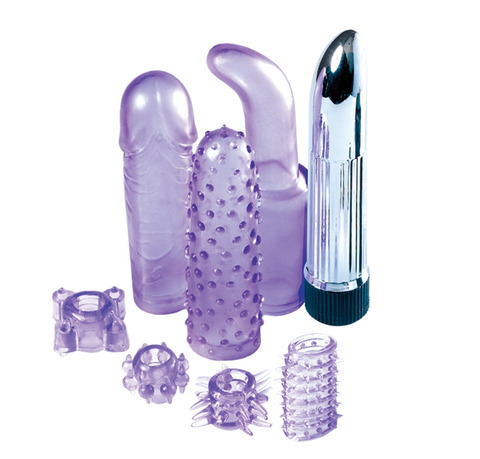 Мини-вибратор с насадками (4 штуки) и эрекционными колечками (3 штуки).