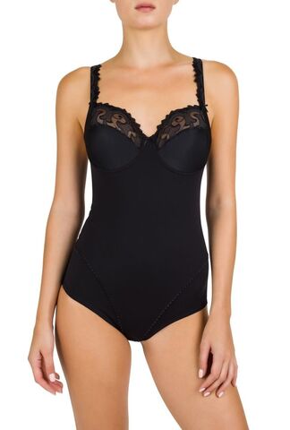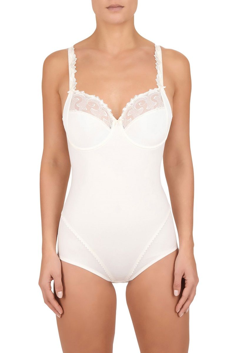 Моделирующее боди с мягкими чашками, на каркасах. Классические чашки с диагональным швом и боковым подкроем декорированы высококачественным швейцарским шитьем в виде роскошных листьев, по линии декольте и на бретелях бюстгальтера , в сочетании с фестончатыми кромками. Эластичная лента с вышивкой, в верхней части чашек бюстгальтера, обеспечивает комфорт и отличную посадку.