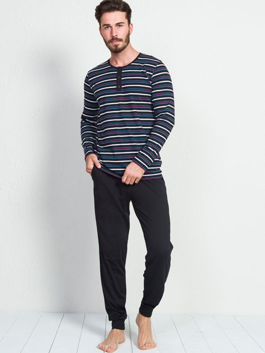Трикотажный комплект. Футболка с длинным рукавом на 3-х пуговицах, футболка в полоску, брюки однотонные, свободного покроя, на манжетах. В комплекте: футболка, брюки.