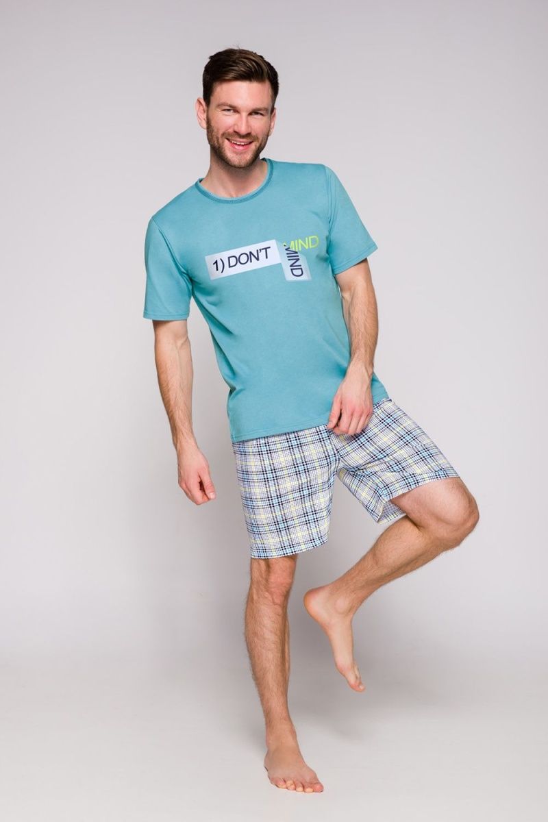 Мужская хлопковая пижама Szymon состоит из футболки голубого цвета и клетчатых шорт. Футболка с коротким рукавом, декорирована принтом в виде надписи на груди. В комплекте: футболка, шорты.