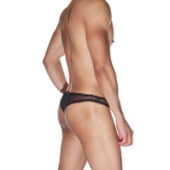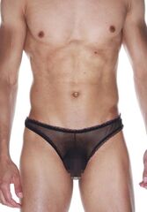 Бразилиана для мужчин из полупрозрачной черной ткани. Окантованы узкой маленькой рюшей, которая оторочена розовым цветом.