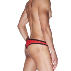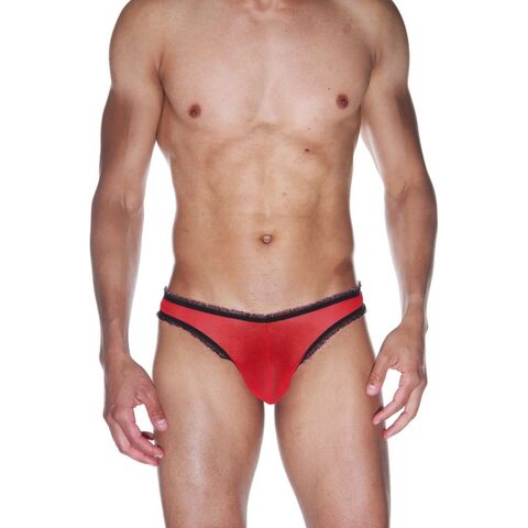 Мужские красные трусы-бразилиана с черной рюшевой отделкой