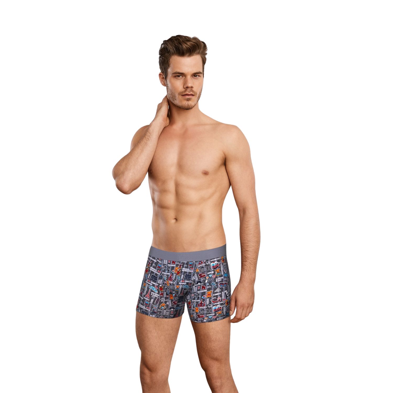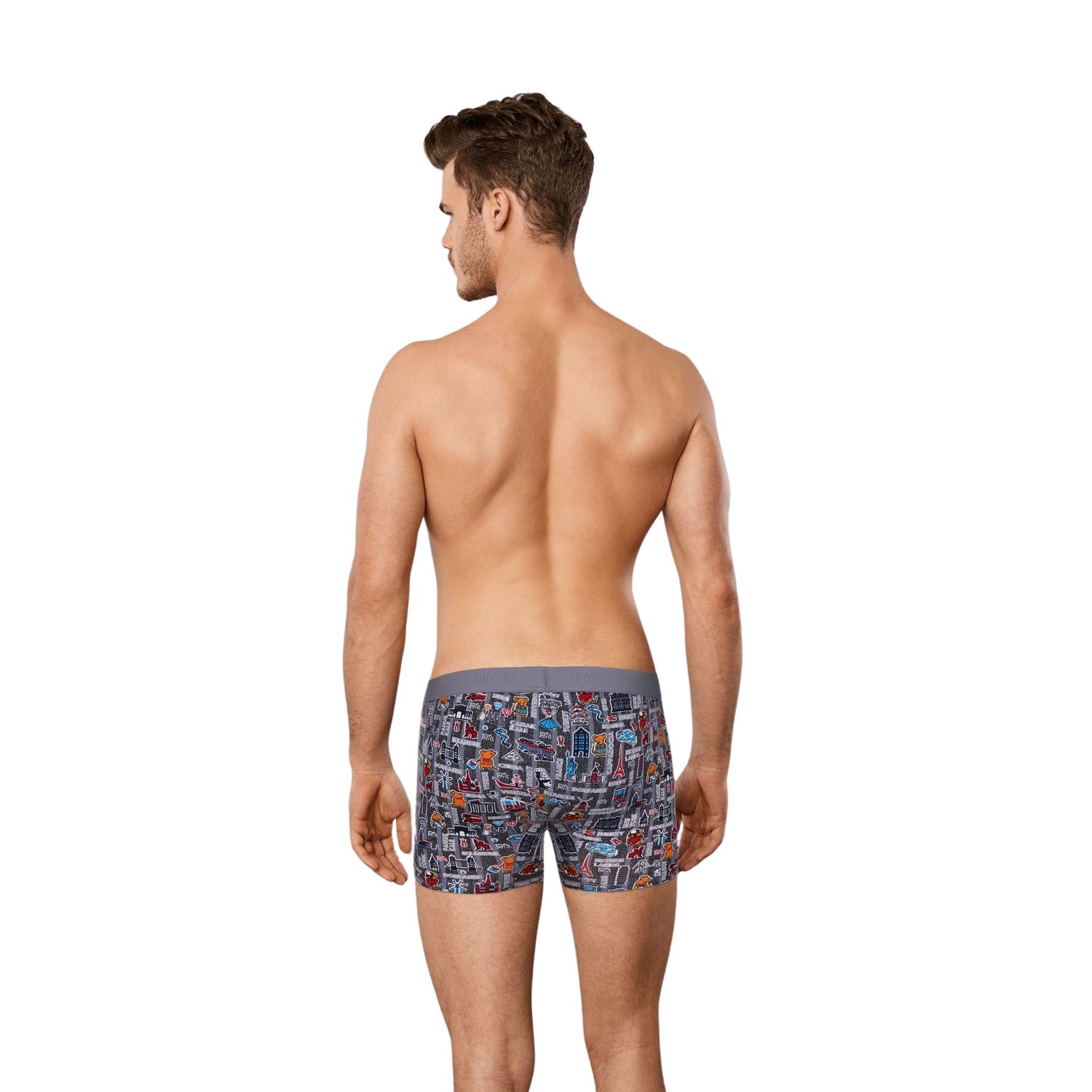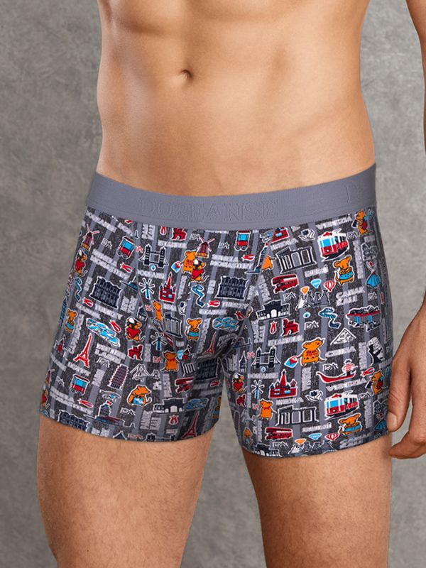 Мужские облегающие трусы-боксеры с принтом из всем знакомых силуэтов-символов разных стран мира. Эластичный дышащий материал из смеси натуральных волокон (хлопок + модал) очень приятен для тела и подходит для ежедневного использования. Передняя панель из двойного слоя материала. На поясе мягкая и комфортная пришивная резинка с фирменным логотипом бренда «Doreanse».