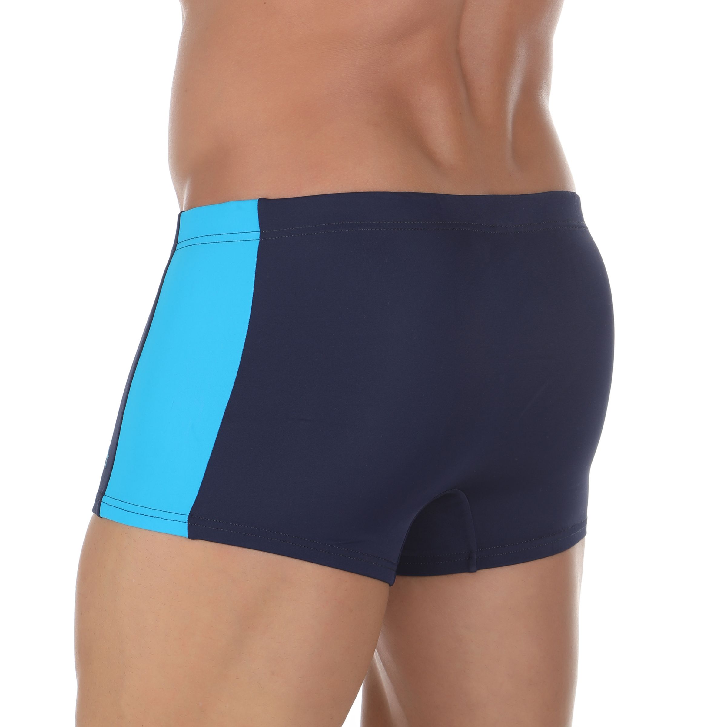 Мужские пляжные плавки-боксеры от Doreanse глубокого тёмно-синего цвета с контрастными бирюзовыми вставками-лампасами по бокам. Мягкий шелковистый материал красиво смотрится на пляже, приятен для тела и быстро высыхает после намокания. На передней панели внутри вшита мягкая шелковистая подкладка. В эластичном поясе вставлен плоский регулирующий шнурок с фирменным логотипом «Doreanse». На левом бедре вышивка из двух стилизованных латинских букв «DA» - символ бренда Doreanse.