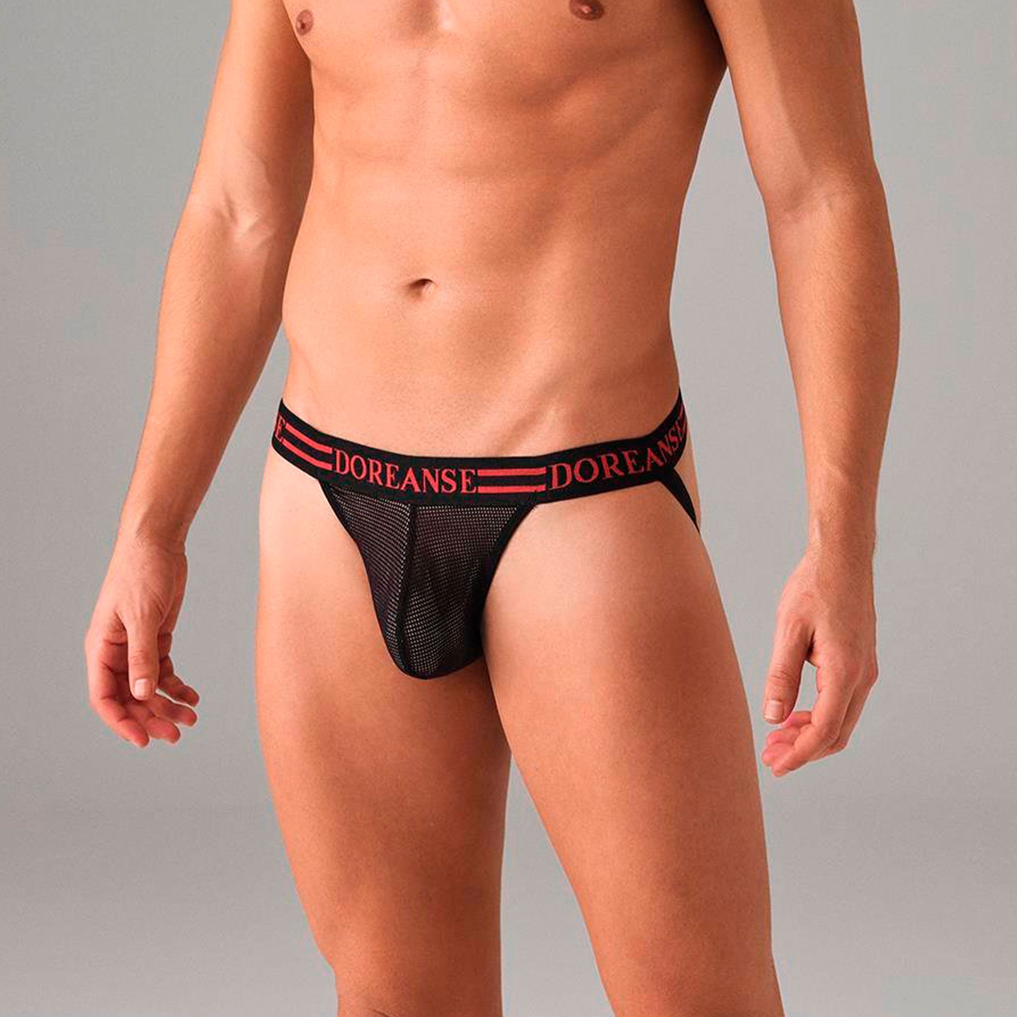 Мужские трусы-джоки из эластичной сеточки. Подкладка бежевого (телесного) цвета создаёт иллюзию полной прозрачности. Резинка на поясе украшена фирменным логотипом бренда DOREANSE. Прекрасный выбор для горячих спортивных парней!