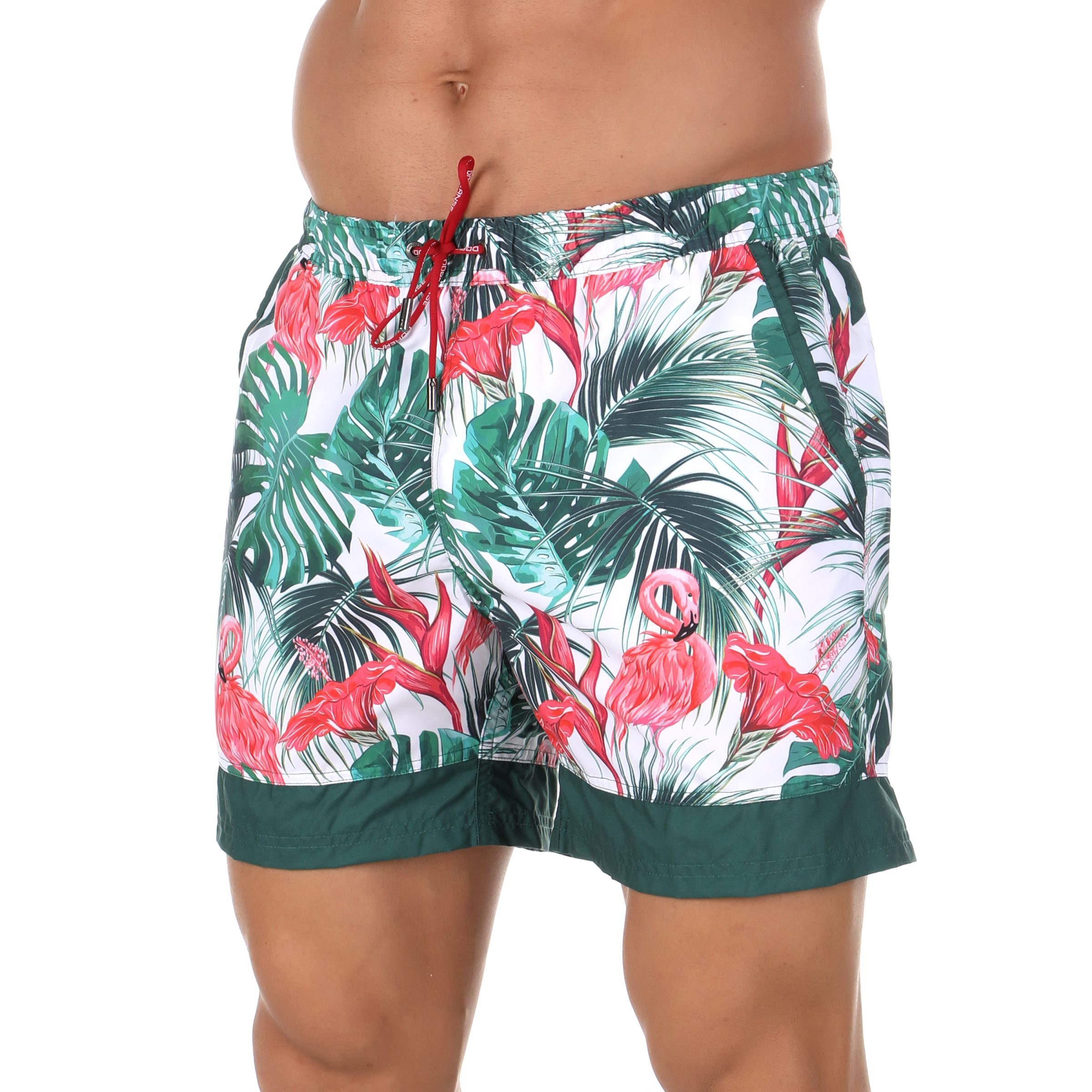 Мужские шорты для плавания с принтом в виде фламинго и тропиков Doreanse. Очень мягкий и приятный для тела материал. Внутри вшита эластичная поддерживающая сеточка. По бокам 2 удобных вшивных кармана, сзади 1 карман с застёжкой-молнией. В эластичный пояс вставлен регулирующий шнурок с логотипом «Doreanse» и стильными металлическими наконечниками.