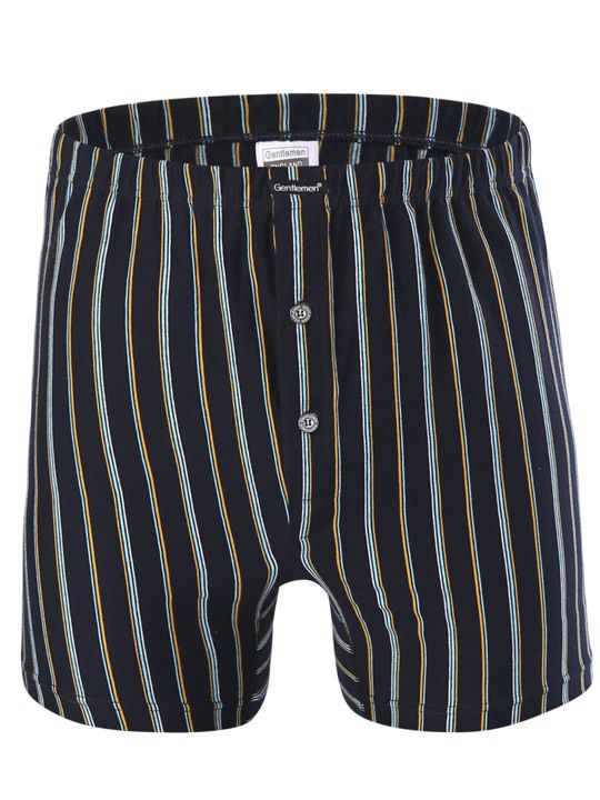 Мужские трусы-боксеры классического длинного фасона с гульфиком, застегивающимся на две пуговицы. Модель оформлена принтом в виде тонких вертикальных полосок и сделана из 100% хлопка.