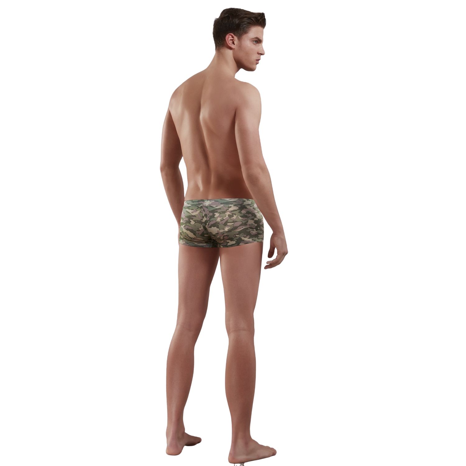 Мужские камуфляжные трусы-хипсы. На левом бедре принт в виде логотипа «DA» (DoreAnse). Мягкий эластичный дышащий материал из смеси натуральных волокон (хлопок + модал) с добавлением эластана. Эластичная резинка на поясе обшита материалом для большего комфорта. Передняя панель с подкладкой.