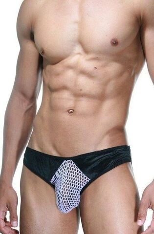 Слипы из сетки и черного материала. Ягодицы и область гениталий прикрыты хорошо тянущейся крупной сеткой, а боковые вставки сшиты из черного гладкого материала.