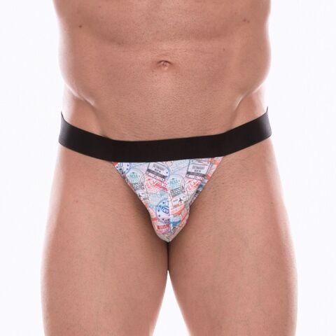 Мужские трусы-танга с принтом в виде цветных штампов.