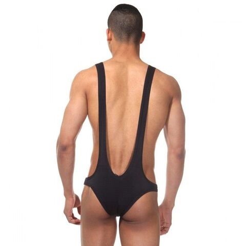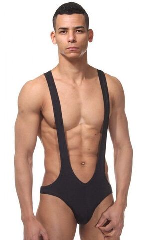 Мужское боди облегающего кроя на широких лямках. Очень глубокий V-образный вырез спереди и сзади.