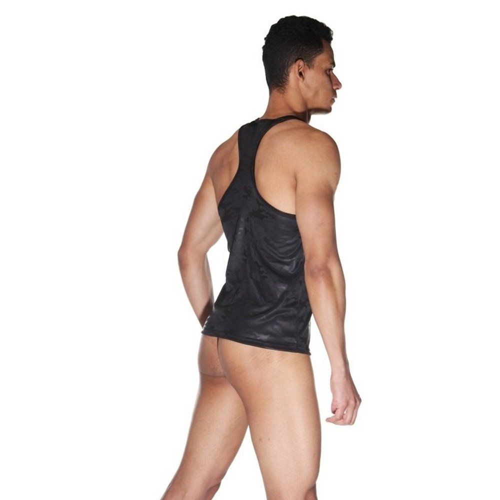 Комплект для мужчин, состоящих из классических трусов-тонгов и майки-борцовки. Комплект отшит из гладкой черной тянущейся ткани. В комплекте: трусы, майка.