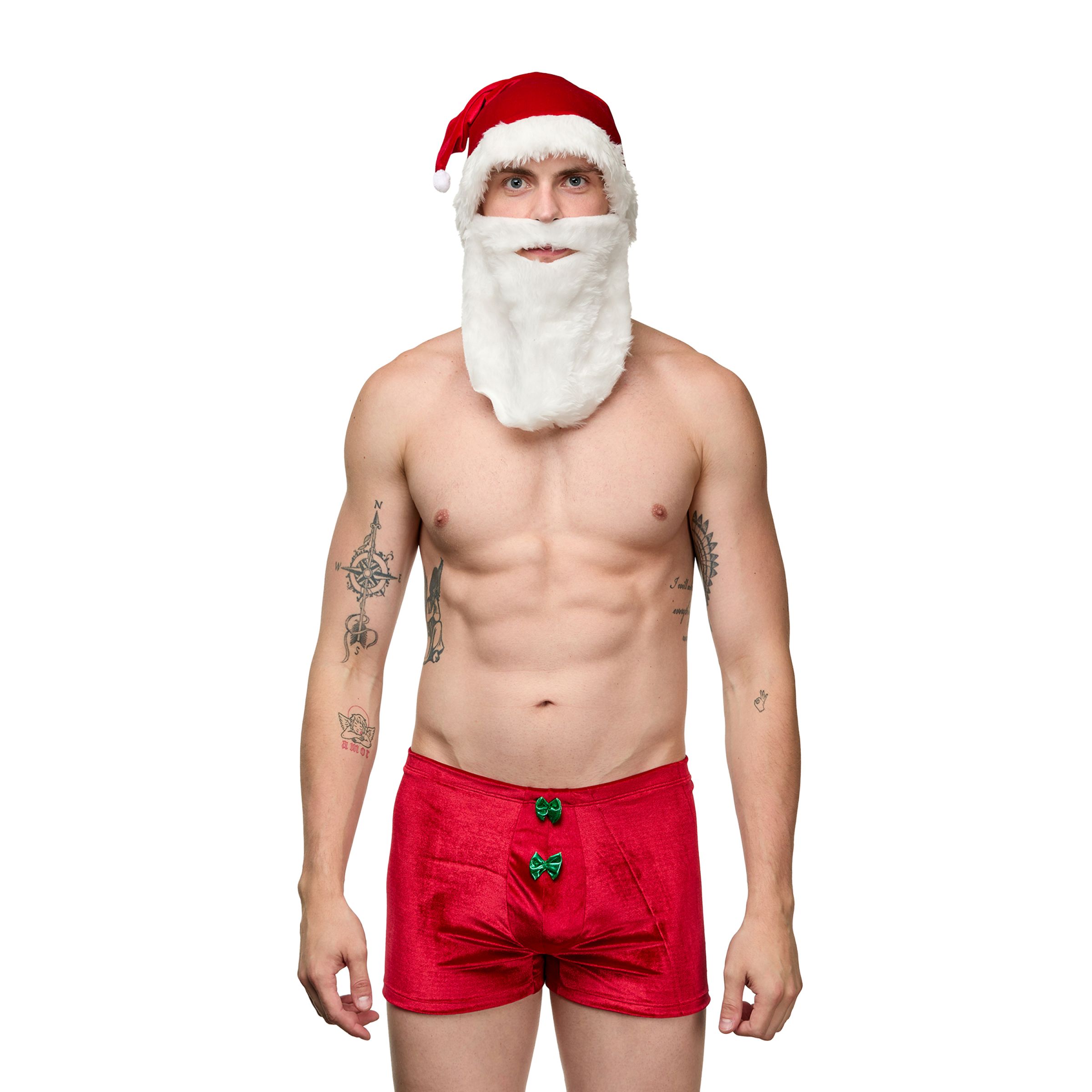 Мужской костюм «Дед Мороз» состоит из 2 предметов: боксеров с вырезом сзади и шапки с бородой. В комплекте: трусы-боксеры, шапка с бородой.