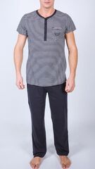 Удобный комплект домашней мужской одежды. Верх – футболка свободного кроя с коротким рукавом, в полоску. Круглый вырез горловины дополнен контрастной декоративной планкой. Низ – свободные брюки. Удобный пояс на резинке обеспечивает комфортную посадку, а свободный фасон не стесняет движений. В комплекте: футболка, брюки.