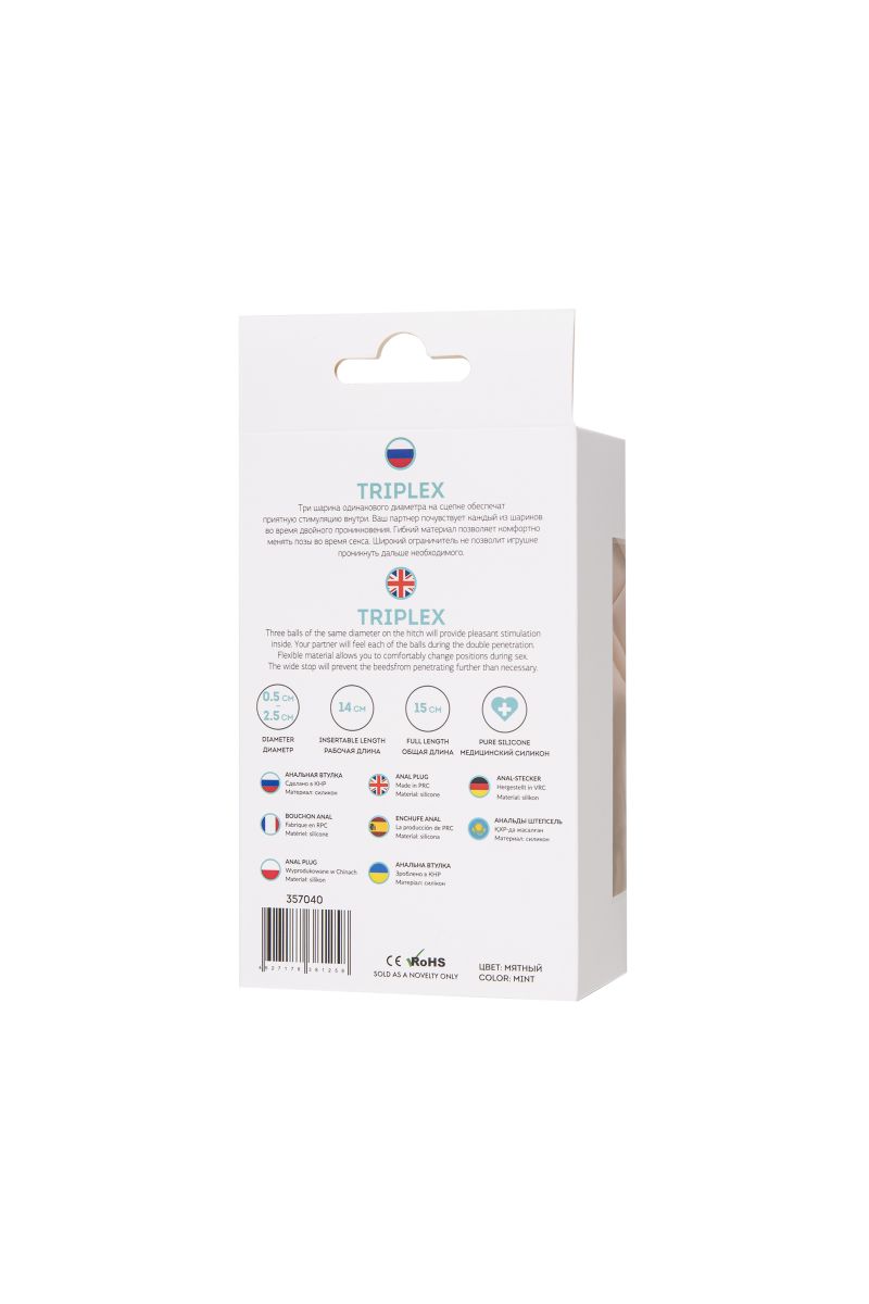 Triplex - три шарика одинакового диаметра на сцепке обеспечат приятную стимуляцию внутри. Ваш партнер почувствует каждый из шариков во время двойного проникновения. Гибкий материал позволяет комфортно менять позы во время секса. Широкий ограничитель не позволит игрушке проникнуть дальше необходимого. Рабочая длина - 14 см.