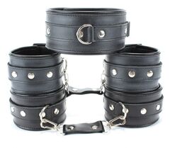 Набор из ошейника, наручников, оков, выполненных из натуральной гладкой кожи черного цвета, декорирован заклепками. У каждого аксессуара есть одно сварное полукольцо. Пряжка сзади позволяет выбирать плотность прилегания атрибутов. Ошейник подойдет на обхват от 26 до 40 см, наручники на обхват руки от 15 до 25 см, оковы подойдут на обхват от 15 до 27 см. Все составляющие можно скреплять по вашему желанию кожаными соединениями на карабинах. Мягкая кожа и практичные соединения обеспечат максимальный комфорт в использовании. Ширина манжет - 6 см.