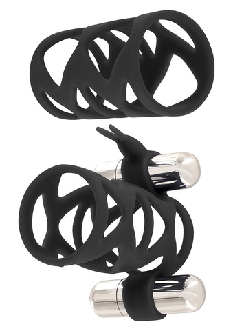 Насадка с открытой головкой с двойной вибрацией и насадка с открытой головкой без вибрации. Можно использовать вместе и отдельно. Растягиваются до нужного диаметра. Вибрация осуществляется при помощи 2 вибропуль, которые располагается в основании одной из насадок. Батарейки в комплекте.