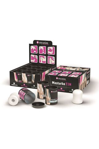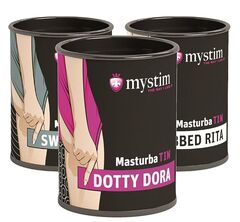 Mystim MasturbaTIN — горячий набор для разнокалиберного удовольствия. В него входят 3 вида мастурбаторов — 4 штуки Swirl Girl, 4 штуки Dotty Dora, 4 штуки Ribbed Rita.