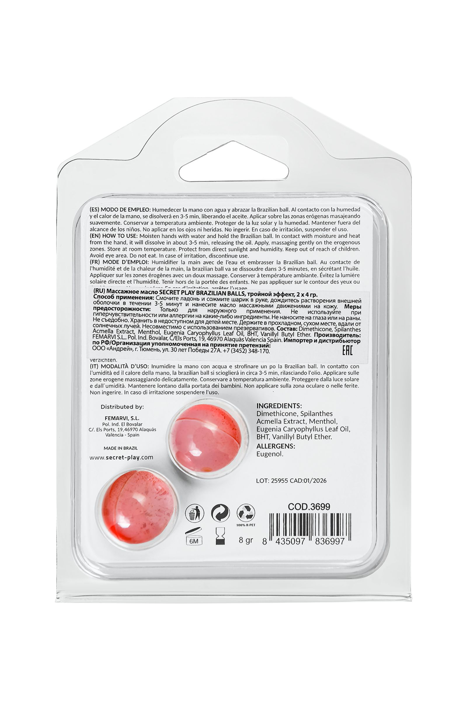Бразильские шарики с тройным эффектом — это уникальное удовольствие, объединяющее сразу три воздействия в одном продукте. Эти шарики созданы для тех, кто ищет новые ощущения и хочет сделать свои чувственные моменты более насыщенными и разнообразными. Попробуйте контрастную игру температур, добавьте нотку пряности и ощутите легкую вибрацию, чтобы сделать прелюдию и эротические игры ещё более захватывающими. Чтобы воспользоваться всеми их преимуществами, просто смочите руку водой и обнимите ладонью шарик. Тепло и влажность активируют его, и через 3–5 минут он растворится, высвобождая массажное масло. Этот тройной эффект — холод, тепло с пряной ноткой и вибрация — стимулирует ваши чувства, создавая ощущения, которые невозможно забыть. Испытайте мощное сочетание трех эффектов и откройте для себя новое измерение удовольствия с бразильскими шариками!