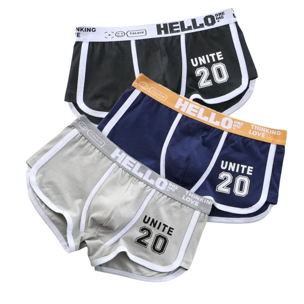 Набор из 3 мужских трусов-боксеров с принтом на резинке: черных, синих и серых.
