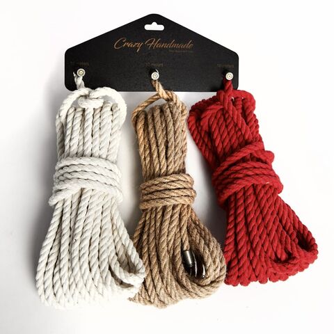 Набор из 3 разноцветных веревок для шибари (белая и красная из хлопка, коричневая из джута).