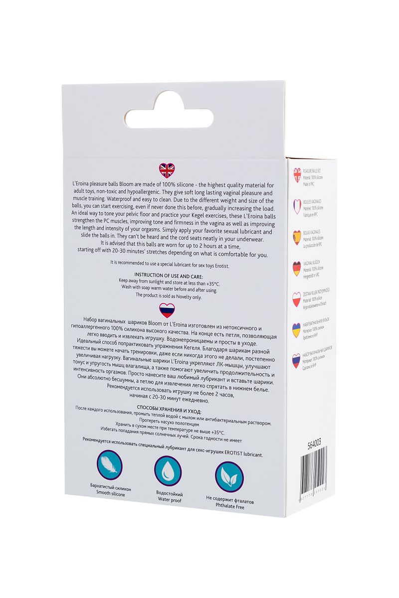 Набор вагинальных шариков Bloom от LEroina изготовлен из нетоксичного и гипоаллергенного 100% силикона высокого качества. На конце есть петля, позволяющая легко вводить и извлекать игрушку. Водонепроницаемы и просты в уходе.