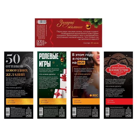 Выберите вид купонов, которые хотите использовать прямо сейчас. Разрежьте их по линии реза, вручите своей второй половинке и наслаждайтесь тем, что будет происходить дальше. Этот Новый год вы запомните надолго! В комплекте: 5 игр.