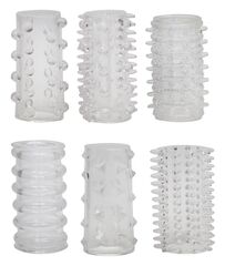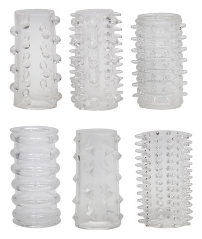 Набор из 6 эрекционных насадок прозрачного цвета на мужской половой орган. Выполнены из гипоаллергенного материала. Структура - с шипами, шишками и ребрами для большей стимуляции. Длина одинаковая, разница только в рельефе. Внутренний диаметр - 1,3 см.